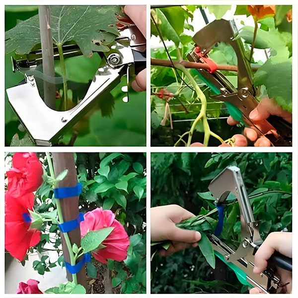 Jednoduchým stlačením rukoväte sa popruh natiahne medzi kliešte. Páska sa potom omotá okolo rastliny, ktorú chcete zviazať. Opätovným stlačením rukoväte pásku utiahnite a odstrihnite. Je to veľmi jednoduché! – Nemusíte sa obávať, že by ste rastliny poškodili alebo ich poranili, pretože páska a zošívačka poskytujú jemné, ale pevné uchopenie.