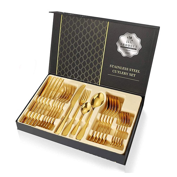 Naša luxusná súprava, ktorá obsahuje komplexný výber príborov, ponúka všetko potrebné na to, aby ste povýšili svoj zážitok z jedla na vyššiu úroveň.